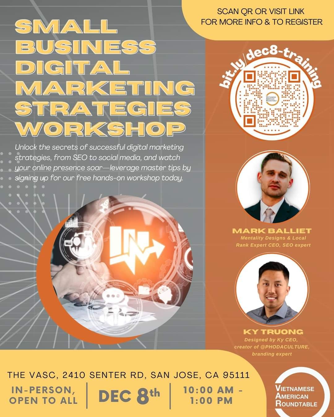 December 8, 2023 @ 10:00 am - 1:00 pm Small Business Digital Marketing Strategies Workshop The VASC 2410 Senter Road, San Jose, CA, United States Are you a small business owner, aspiring entrepreneur, influencer, restaurant manager, non-profit leader, or simply curious about SEO and digital marketing? Unlock your digital Free