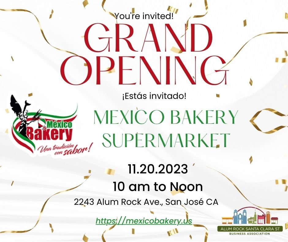 November 20, 2023 @ 10:00 am - 12:00 pm Grand Opening Mexico Bakery Supermarket Mexico Bakery Supermarket 2243 Alum Rock Ave, San Jose, CA