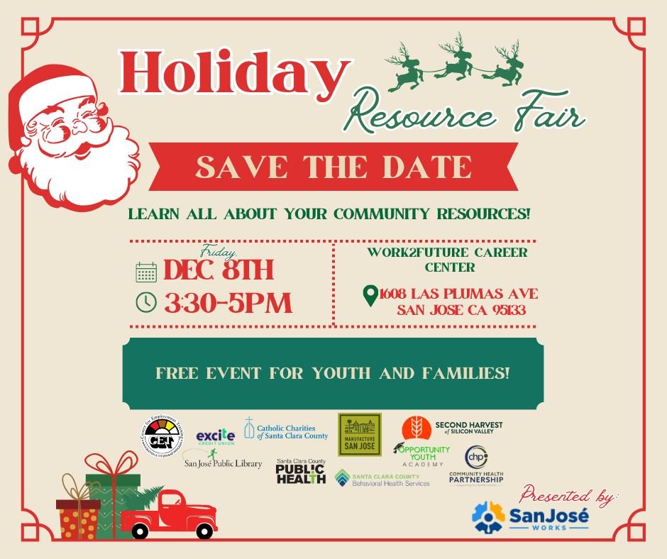 December 8, 2023 @ 3:30 pm - 5:00 pm Holiday Resource Fair Work2Future Career Center 1608 Las Plumas Ave, San Jose, CA, United States Unlock the power of community connections at the San Jose Works Holiday Resource Fair! Join the event on Friday, December 8th, from 3:30 to Free