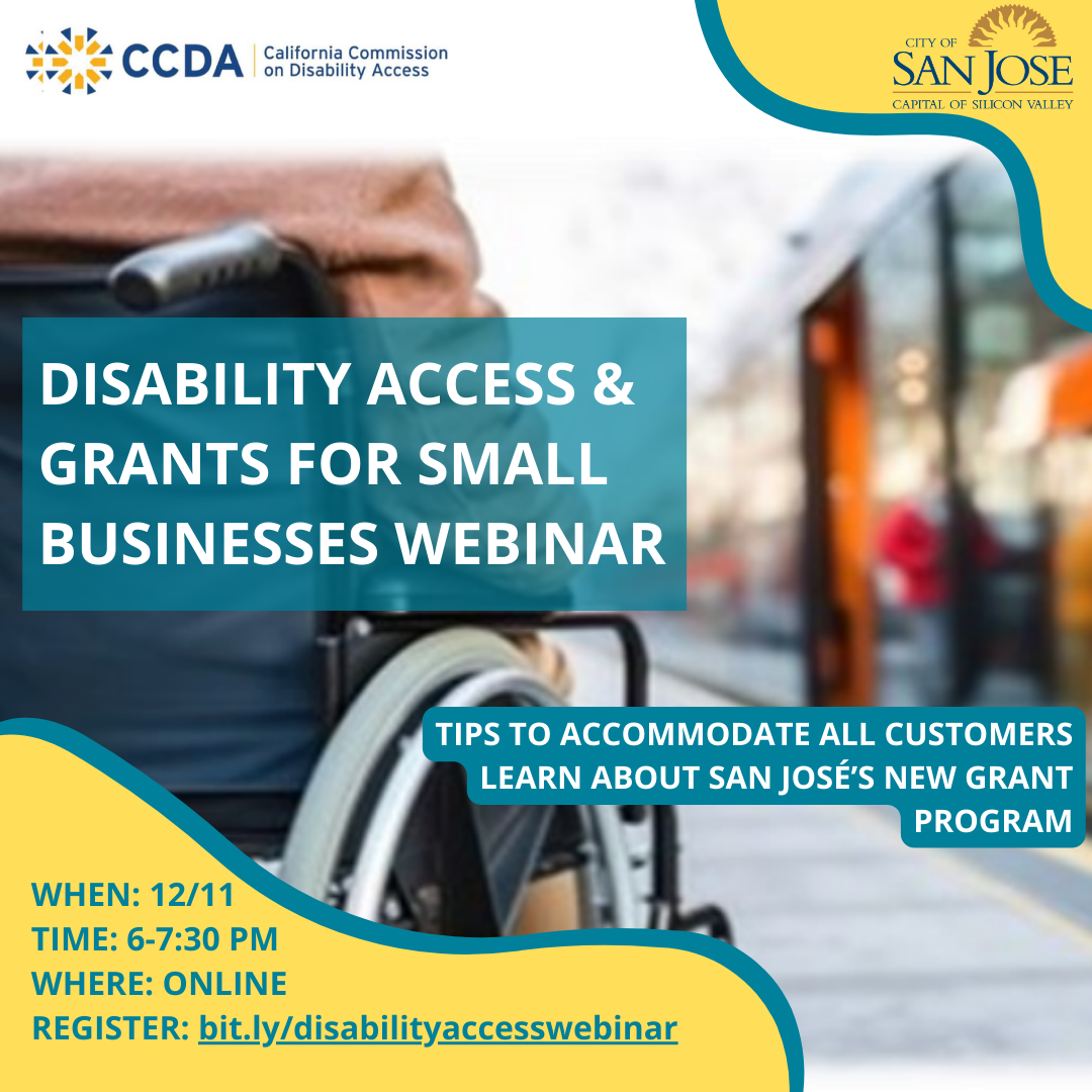 December 11, 2023 @ 6:00 pm - 7:30 pm Disability Access & Grants for Small Businesses San Jose City Hall 200 E Santa Clara Street, San Jose, CA, United States Join the California Commission on Disability Access and the City of San José to discuss disability access, tips to ensure a business is ready to Free