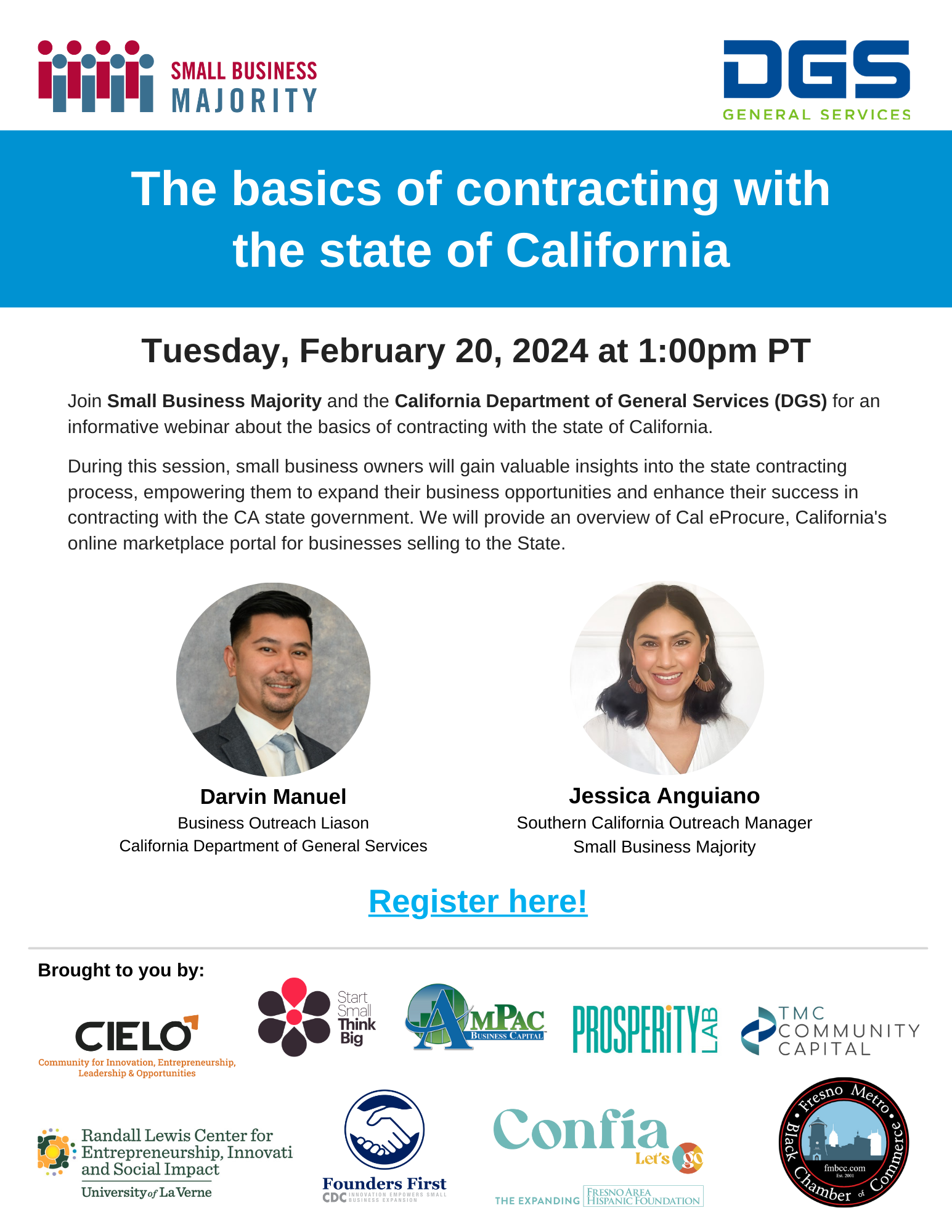 Join Small Business Majority and the California Department of General Services (DGS) for an informative webinar about the basics of contracting with the state