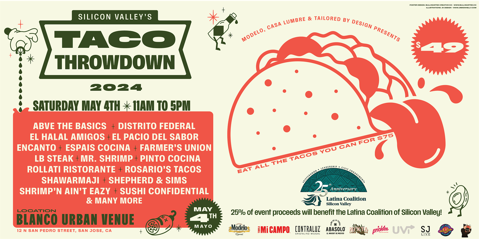 May 4, 2024 @ 11:00 am - 5:00 pm Silicon Valley Taco Throwdown Blanco Urban Venue 12 North San Pedro Street, San Jose, CA TBD* Presents: The Silicon Valley Taco Throwdown Buckle up, beautiful people, because Silicon Valley’s about to get schooled in the art of the taco! $49 – $129