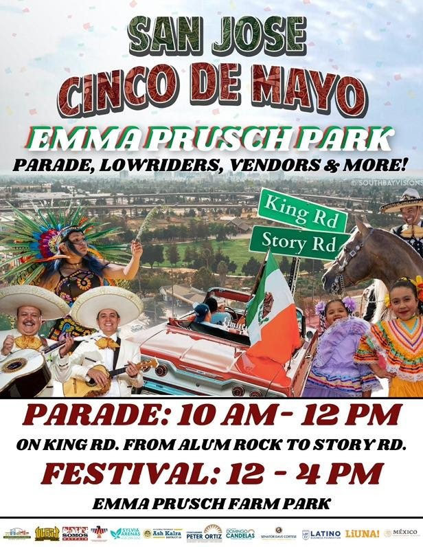 May 5, 2024 @ 10:00 am - 12:00 pm San Jose Cinco De Mayo @ Emma Prusch Park Emma Prusch Park & Farm 647 S king Road, San Jose, CA Join the Alum Rock Santa Clara Street Business Association and Council member Peter Ortiz, D5 for the East San José Cinco de Mayo Parade