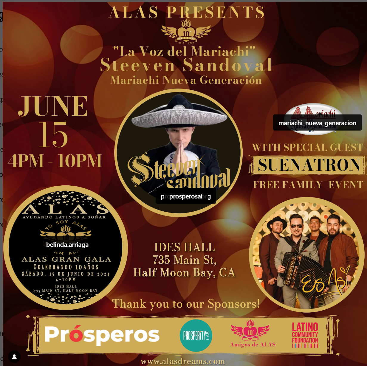 June 15, 2024 @ 4:00 pm - 10:00 pm ALAS 10 YEAR CELEBRATION GALA IDES Hall 735 Main Street, Half Moon Bay, CA Han sido 10 HERMOSOS años en ALAS y qué alegría ha sido servir a nuestra comunidad! ALAS fue construido por y para la comunidad; Free
