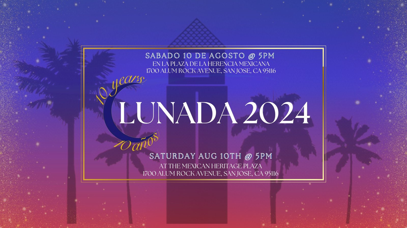 August 10, 2024 @ 5:00 pm - 7:00 pm LUNADA 2024 Mexican Heritage Plaza 1700 Alum Rock Avenue, San Jose, CA, United States Latinos Unidos por una Nueva América (LUNA), invita a la comunidad a la LUNADA para celebrar su décimo aniversario. LUNADA reúne a actores clave,