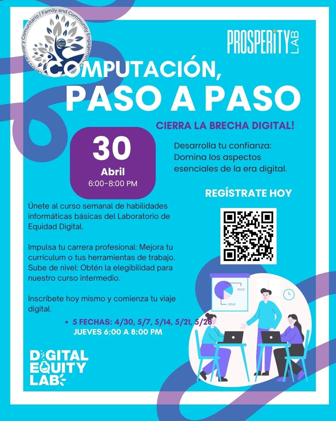 Cierra la brecha digital! Únete al curso semanal de habilidades informáticas básicas del Laboratorio de Equidad Digital. Desarrolla tu confianza: Domina los aspectos esenciales