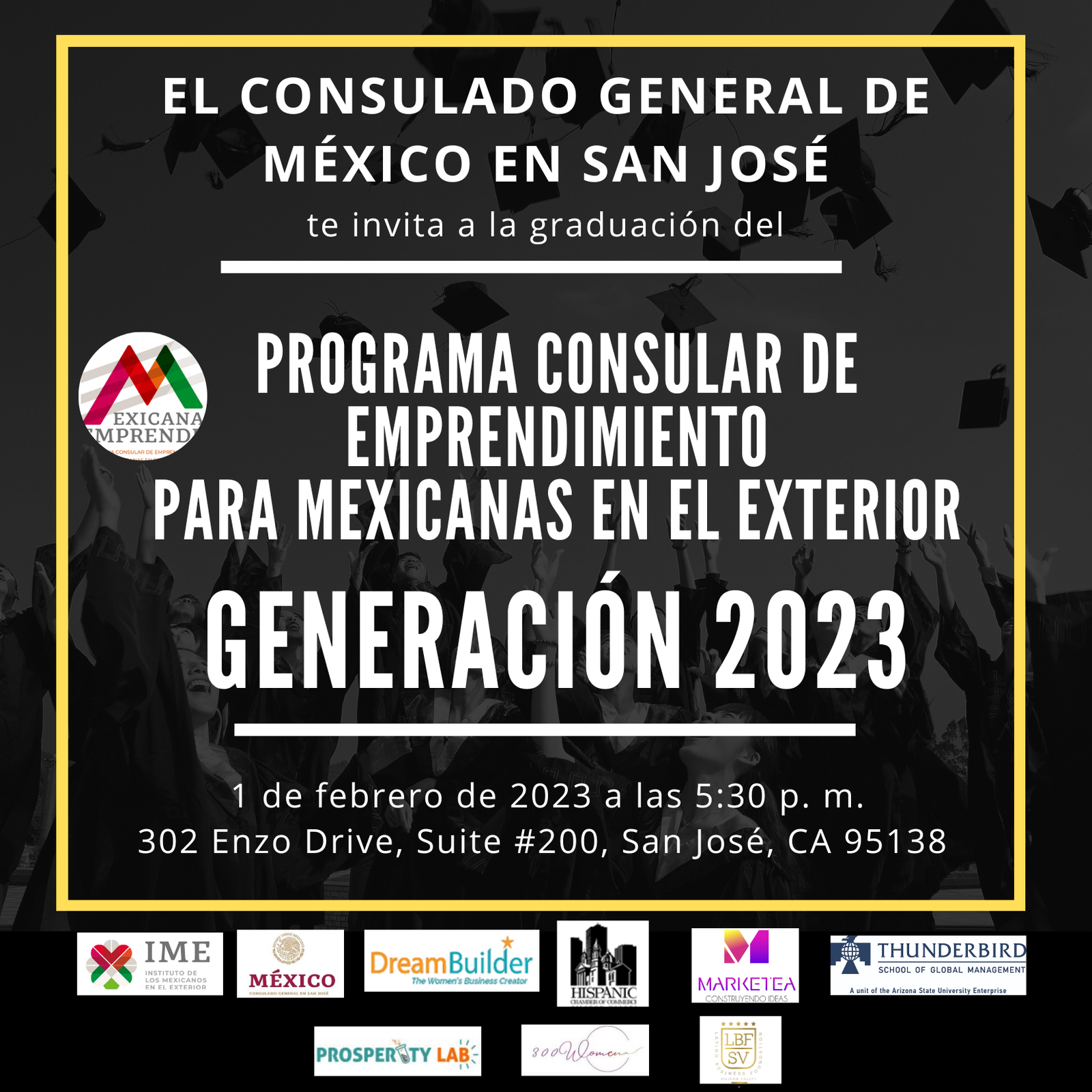 Anteponiendo un respetuoso saludo, el Consulado General de México en San José, California, le extiende una atenta invitación para asistir a la Ceremonia de fin de cursos del Programa Consular de Emprendimiento para Mexicanas en el Exterior, 3ª Edición. El evento se realizará como sigue: Lugar: Consulado General de México en San José